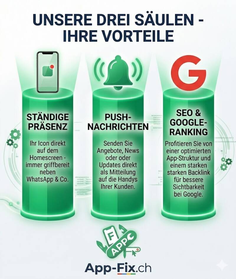Wir optimieren nicht nur die App-Struktur, sondern stärken Ihre Webseite durch einen wertvollen Backlink von App-Fix.ch. Das signalisiert Google: Ihre Seite ist relevant und technisch auf dem neuesten Stand – für bessere Platzierungen in der Suche.